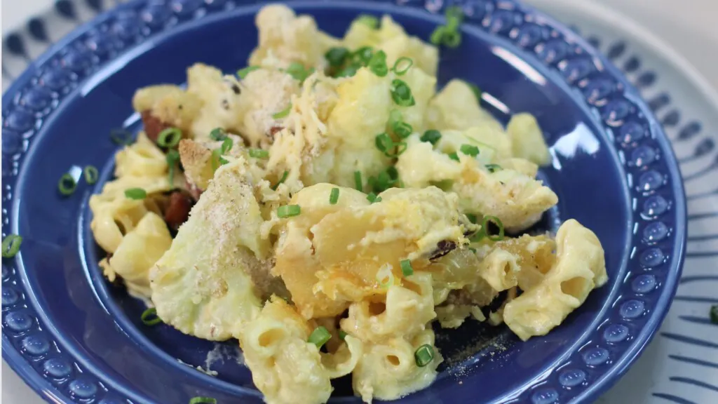 Preaqueça o forno a 175°C. Corte a couve-flor em floretes pequenos e escalde-os em água fervente com uma colher de sopa de sal por 3 minutos. Escorra e reserve. Cozinhe o macarrão em água salgada até ficar al dente, cerca de 10-11 minutos. Escorra e reserve. Em uma frigideira grande, frite o bacon em fogo médio até ficar crocante. Retire o bacon e reserve, deixando a gordura na frigideira. Na mesma frigideira, adicione a manteiga e a farinha de trigo, mexendo continuamente por 2-3 minutos para formar um roux. Aos poucos, adicione o leite e o creme de leite, mexendo constantemente até o molho começar a engrossar. Desligue o fogo e adicione os queijos cheddar amarelo e branco ralados, mexendo até derreter completamente. Em uma assadeira de 9×6, misture o macarrão cozido, a couve-flor e o bacon frito. Despeje o molho de queijo por cima e misture bem. Cubra com o restante dos queijos e polvilhe a farinha de rosca por cima. Asse por 15-20 minutos ou até a superfície ficar dourada e crocante. Retire do forno e deixe esfriar por alguns minutos antes de servir.